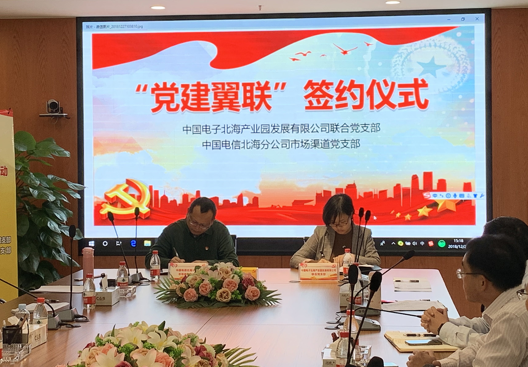 為深入學(xué)習(xí)貫徹黨的十九大精神,堅(jiān)持以習(xí)近平新時(shí)代中國(guó)特色社會(huì)主義思想為指導(dǎo),落實(shí)新時(shí)代黨的建設(shè)總要求,充分發(fā)揮基層黨支部的主體作用,激發(fā)黨員的活力。2018年12月27日,中國(guó)電子北海產(chǎn)業(yè)園發(fā)展有限公司聯(lián)合支部委員會(huì)、中國(guó)電信股份有限公司北海分公司市場(chǎng)渠道支部委員會(huì)簽署了“黨建翼聯(lián)”合作書(shū),旨為整合雙方在黨建、科技、電子信息產(chǎn)業(yè)的資源優(yōu)勢(shì),以共建共享為基礎(chǔ),以合作共贏為目的,積極拓展黨組織功能,發(fā)揮黨員先鋒模范作為,積極推進(jìn)事業(yè)發(fā)展,助力北海電子信息產(chǎn)業(yè)升級(jí)轉(zhuǎn)型。